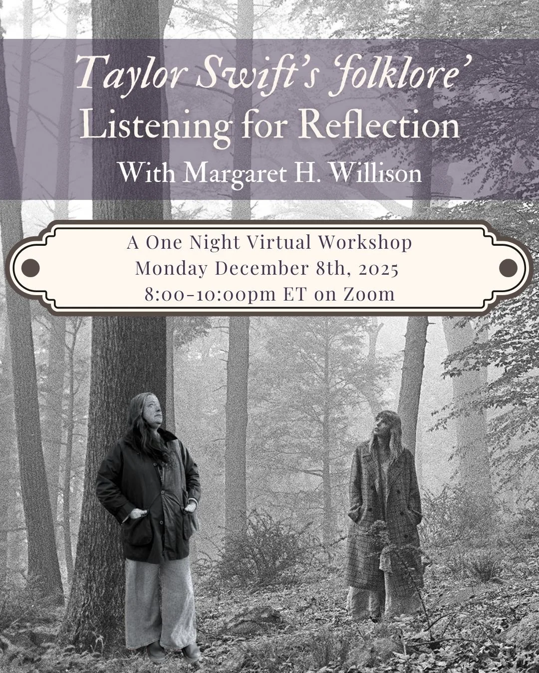 In honor of the 5th anniversary of their release, I am hosting a pair of workshops dedicated to Taylor Swift’s albums ‘folklore’ and ‘evermore.’ On Monday, December 8th, we will meet to discuss ‘folklore’ and on Monday, December 15th, we will focus on ‘evermore.’ Using specially developed exercises, we listen closely to songs from these albums, both delving into their artistry and tracing how their content connects to our own lives. You can attend just one workshop or, if your appetite is sufficiently hearty, buy a combo ticket that will admit you to both for 20% off. As we say farewell to 2025, give yourself these two nights for reflection and quiet companionship.